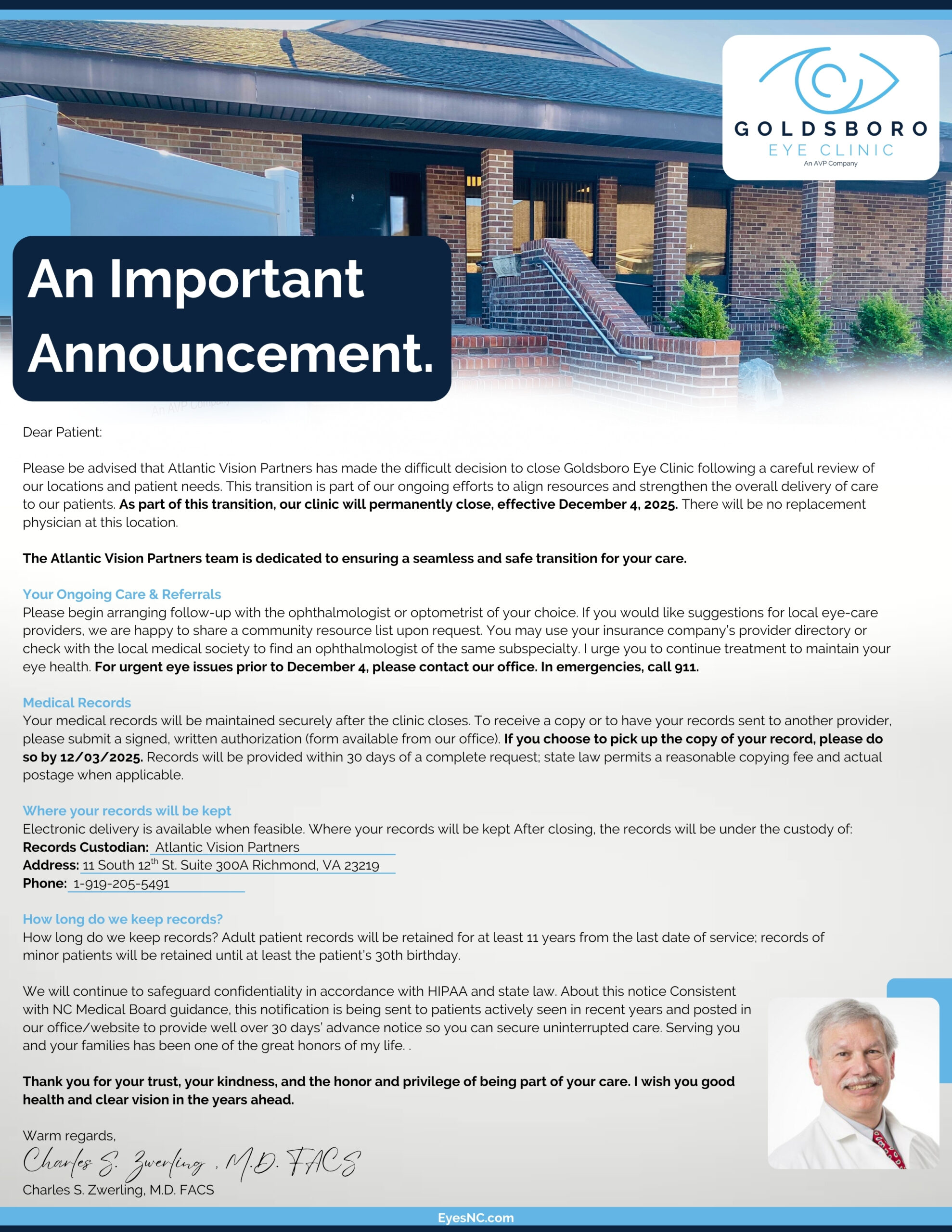 Goldsboro Eye Clinic will permanently close on December 4, 2025, as part of our ongoing efforts to align care and resources across our network. We are deeply grateful for the trust you’ve placed in us and want to ensure your vision care continues without interruption. Patients are encouraged to begin arranging follow-up with an ophthalmologist or optometrist of their choice, and we are happy to provide a list of local providers upon request. Medical records will remain securely stored and can be transferred to your new provider — see below for details on how to request them and continue your care.